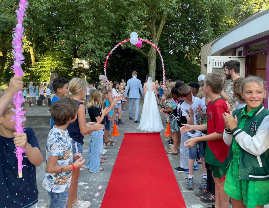 Afgelopen zomervakantie is juf Esther getrouwd en dit vierden we met de hele school op woensdag 23 augustus. Het bruidspaar kwam in trouwkleding naar school en de kinderen en leerkrachten stonden op het plein met prachtige bogen en een uitgerolde rode loper.